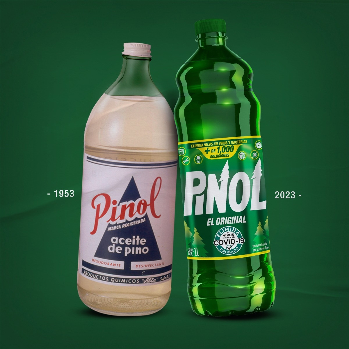 - Pinol® nace el 7 de octubre de 1953, con un envase de vidrio traslúcido, destacando la figura de pino para hacer referencia a su esencia y este 2023 se cumplen 70 años de una marca llena de tradición y con un compromiso claro con las familias mexicanas