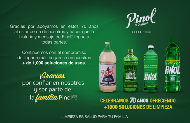 Pinol®, una marca icónica y muy querida desde 1953, se ha consolidado como líder, confiable e innovadora, capaz de enfrentar cualquier reto de limpieza gracias a su poderosa fórmula de aceite de pino, celebra sus 70 años, convirtiéndose en una marca aliada dentro y fuera del hogar y considerada como el único limpiador con más de 1,000 usos y soluciones.