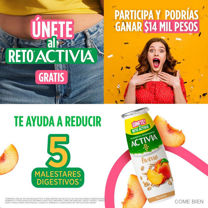Participar en Reto ActiviaⓇ 2024 no sólo implica mejorar la salud digestiva en 14 días, sino que también brinda la oportunidad de participar para ganar $14 mil pesos (MXN). La inscripción es rápida, sencilla y totalmente gratuita. A través del reto, las participantes encontrarán actividades diseñadas por especialistas en fitness, wellness y nutrición, con el objetivo de incentivar la adopción de nuevos hábitos saludables y comenzar el 2024 con bienestar integral.
