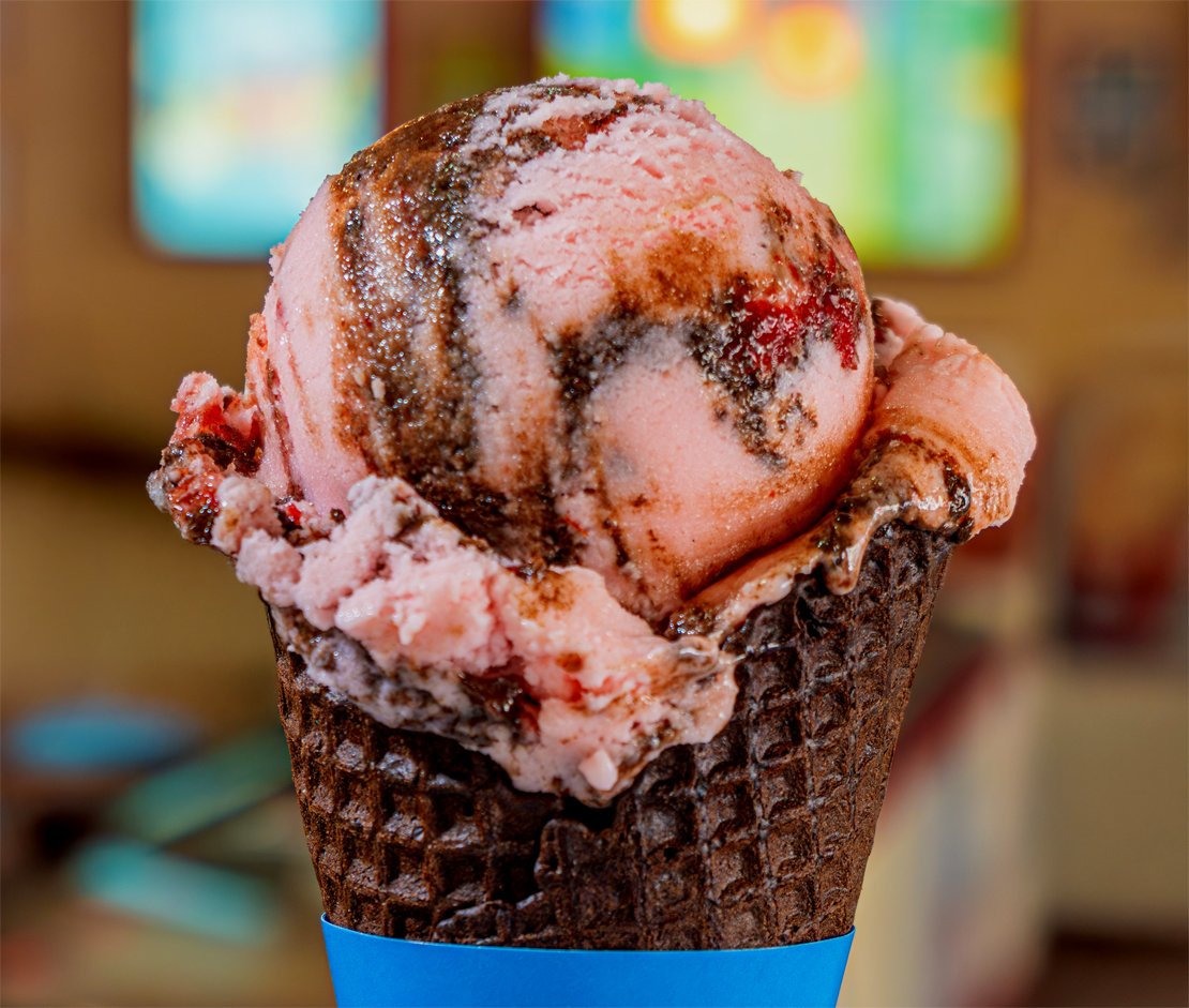 El helado de Gansito combina una base intensa de chocolate con vetas de mermelada de fresa y accidentes suaves de la golosina, que añaden textura y pequeños momentos sorpresa en cada cucharada. El resultado es un postre reconfortante, donde la nostalgia se encuentra con una lectura contemporánea del sabor.