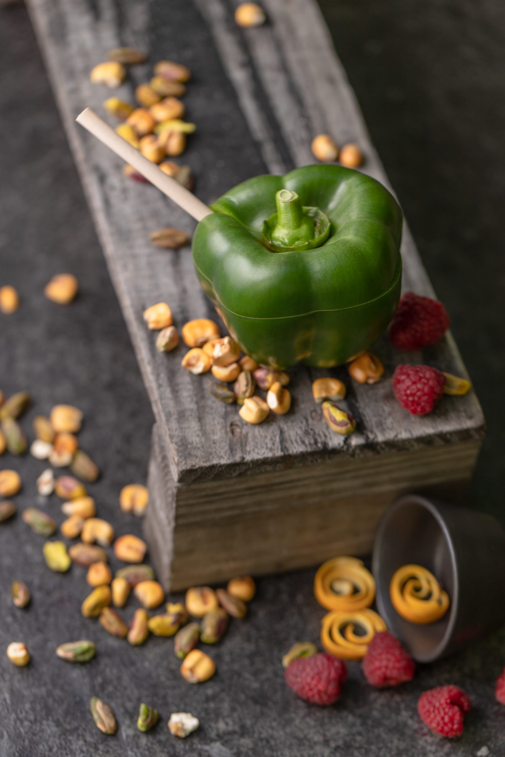 Los ingredientes se incorporan en un vaso shaker con hielo, se mezcla durante 15 segundos y es servido en un pimiento verde.