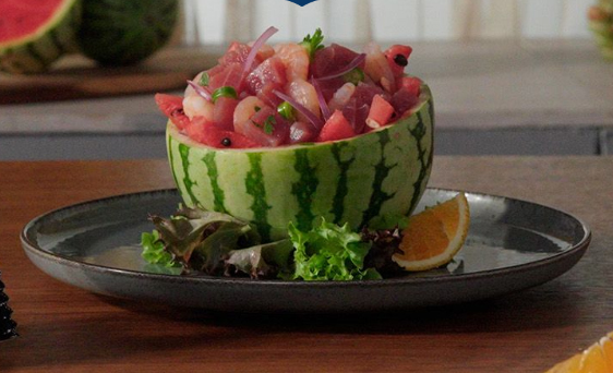 2. Mezcla en un tazón la sandía, la cebolla, el chile serrano, el mix cevichero y el jugo de limón y naranja.