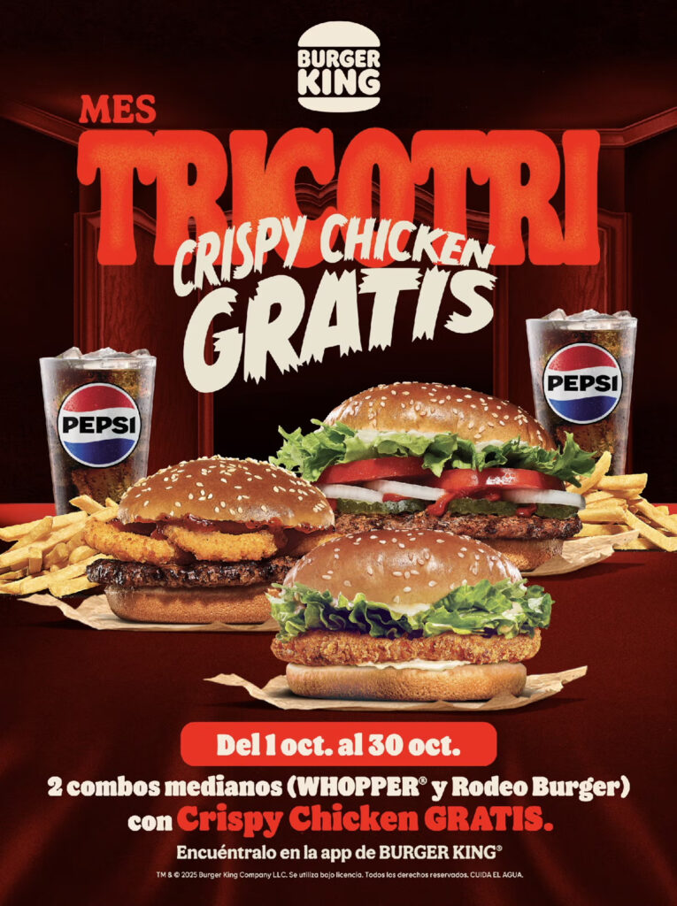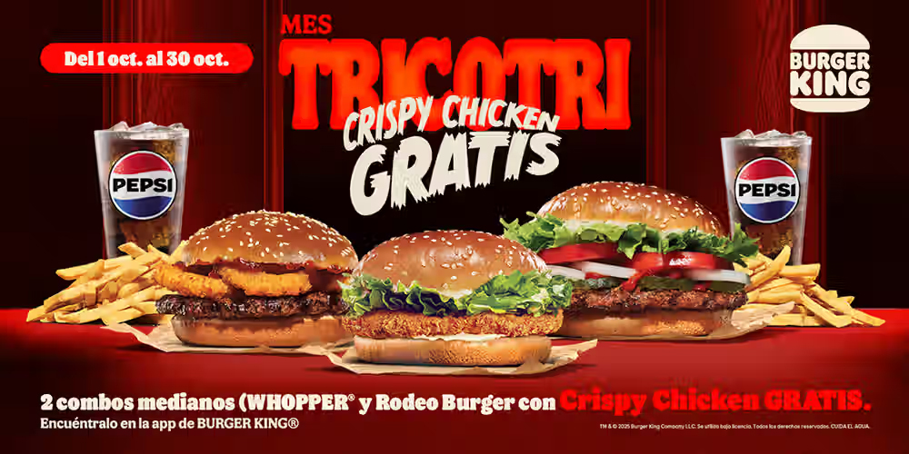 - Del 1 al 29 de octubre: En la compra de un combo WHOPPER® o un combo Rodeo Burger medianos, obtén un Crispy Chicken® gratis exclusivamente en app y en las sucursales.