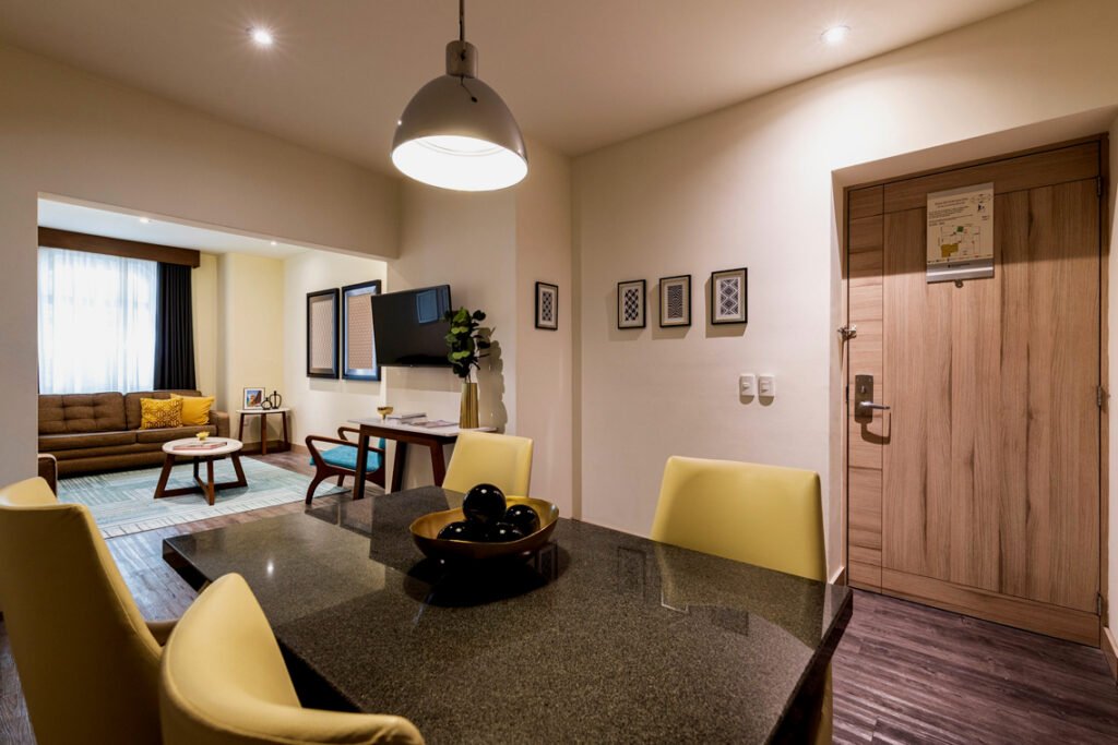 La habilidad del Arq. Armela en combinación con la experiencia y creatividad del equipo de Dominion, arrojaron como resultado un espacio único. Habitaciones amplias y cómodas que resuelven las necesidades del viajero más exigente y lo hacen sentir como en casa ya que todas tienen estancia, cocina, una decoración que combina la modernidad y la esencia Art Decó del espacio, y hasta centro de lavado para aquellos que viajan por periodos más prolongados.