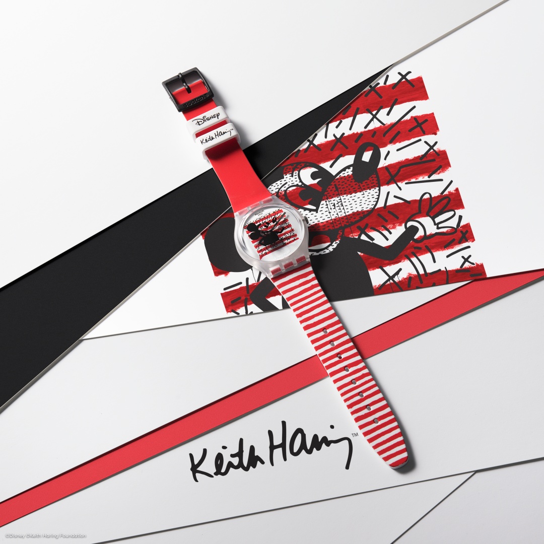 Los relojes Swatch transforman el trabajo de Keith Haring y Mickey Mouse en arte para llevar. La representación de Haring de Mickey no siempre es la típica versión de Disney. Aunque Mickey Mouse es perfectamente reconocible en los diseños, todos presentan el inconfundible giro de Haring al examinarlos de cerca, como la nariz de la esfera que presenta el modelo MICKEY BLANC SUR NOIR.