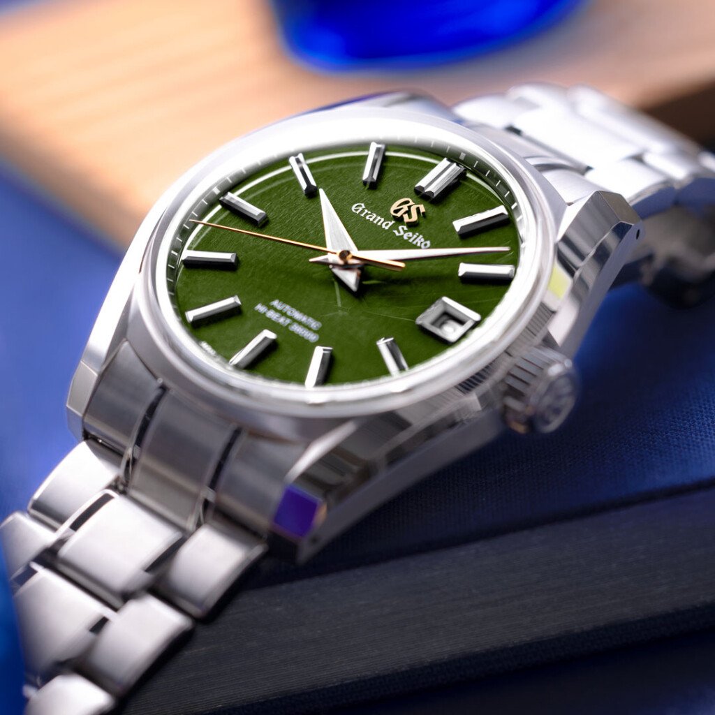Al igual que el SBGH353, retoma el diseño del 62GS, destacando líneas nítidas y superficies que reflejan la luz de manera perfecta. Los detalles dorados del segundero y del logotipo GS aportan un contraste armónico con la textura verde profunda de la esfera.