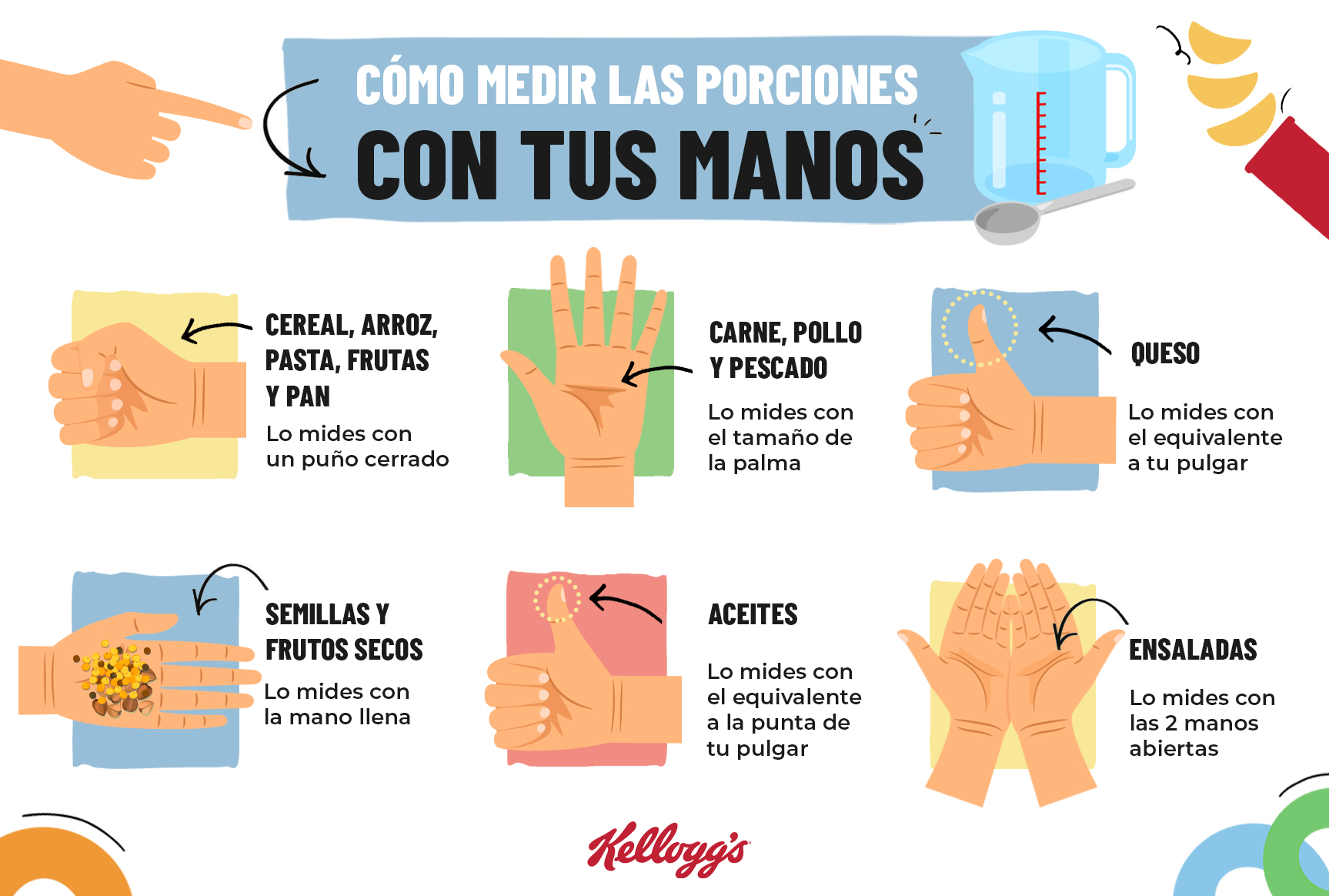 Pero, ¿cuántos tenemos tazas medidoras o básculas en nuestras cocinas? Para no exceder la porción recomendada, podemos utilizar otras formas de medición como nuestras manos, un o una taza.