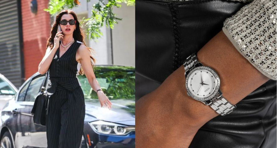 Durante otras escenas, el vestuario confirma una fórmula que funciona: prendas sobrias + joyería bien pensada. Se repiten los relojes petite, los aretes discretos tipo botón y hasta pañuelos de seda al cuello o como acento en la muñeca. Detalles que actualizan el look, sin esfuerzo.