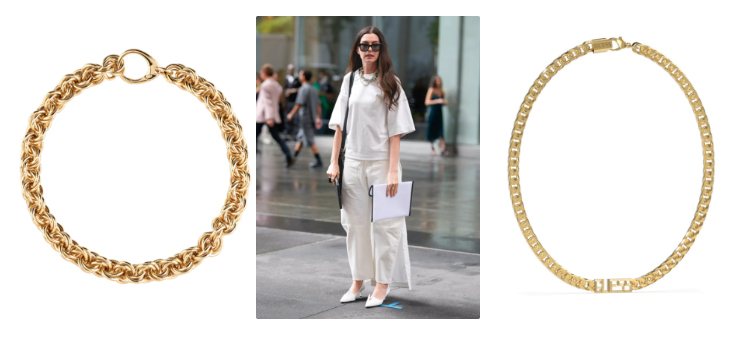Uno de los más comentados: total look blanco con líneas arquitectónicas, pantalones de estructura fluida, blusa de manga amplia, kitten heels y un collar chunky que marca el paso (literalmente) en las calles de Nueva York. El mejor ejemplo de cómo una sola pieza de joyería puede convertir una base neutra en un look editorial.