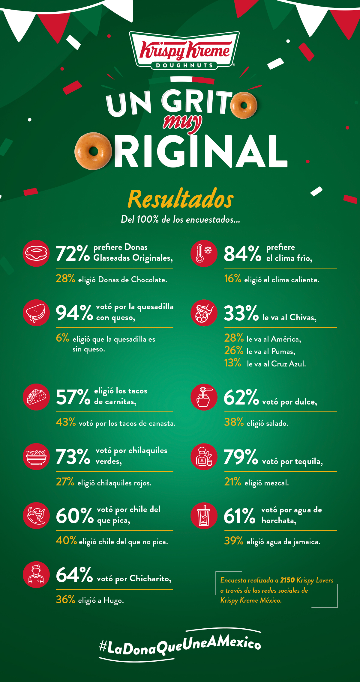 Krispy Kreme realizó una divertida encuesta a través de sus redes sociales para conocer los gustos de los mexicanos y festejar unidos la independencia de México. Los resultados fueron reveladores porque el 72% de los encuestados prefiere la Dona Glaseada Original vs. la de chocolate, el sabor dulce está un 62% por encima de lo salado con un 38%. De agua fresca la horchata salió como la preferida con un 61% vs. el agua de jamaica. En temas de clima, el frío fue el elegido con un 84% ante el calor.