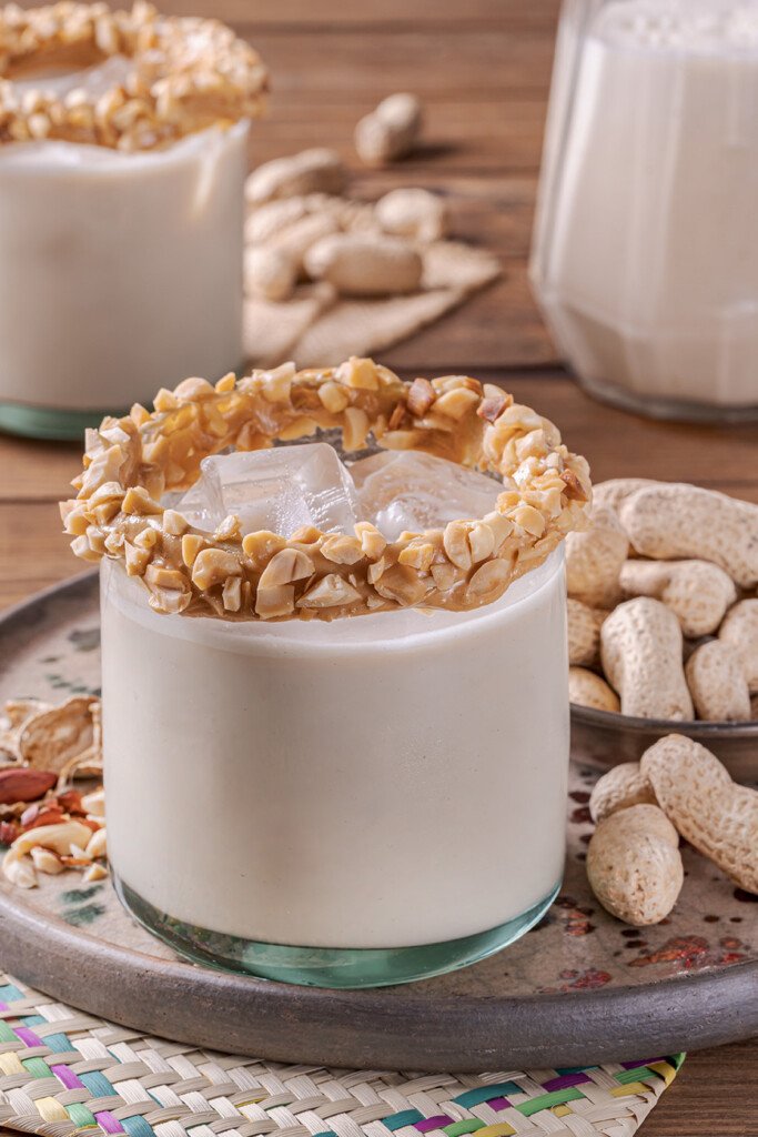 - Escarcha los vasos con crema de cacahuate mezclada con cacahuates picados. Antes de servir, añade hielos.
