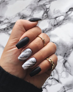Efecto Mármol. El efecto mármol toma inspiración de cualquier piedra semipreciosa como el jade, el cuarzo y la esmeralda. Son muy llamativas y estrellas como Rihanna han llevado esta manicura en varias ocasiones. Aunque existen diferentes maneras de lograr el efecto, generalmente consiste en utilizar una base blanca para que se puedan apreciar mejor los acabados y las líneas.