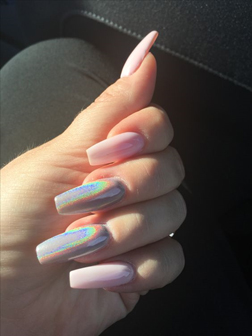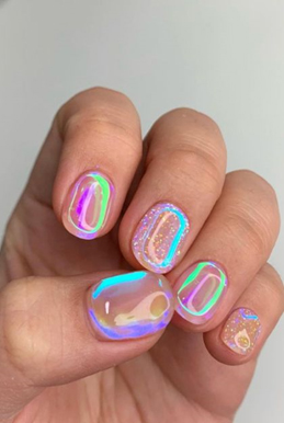 Efecto unicornio. Se logra gracias a un polvo holográfico de diferentes colores que se pone con una esponja sobre la base del color elegido, para lograr una mayor fijación del pigmento. Aunque este nail art puede verse simple al momento de aplicarlo, el efecto arcoíris con brillo hará lucir tus manos increíbles.