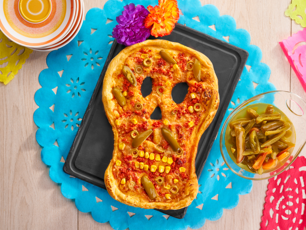 1. Estirar la masa para pizza hasta formar un círculo con grosor de 0.5 cm. Cortar en forma de calavera y doblar las orillas.