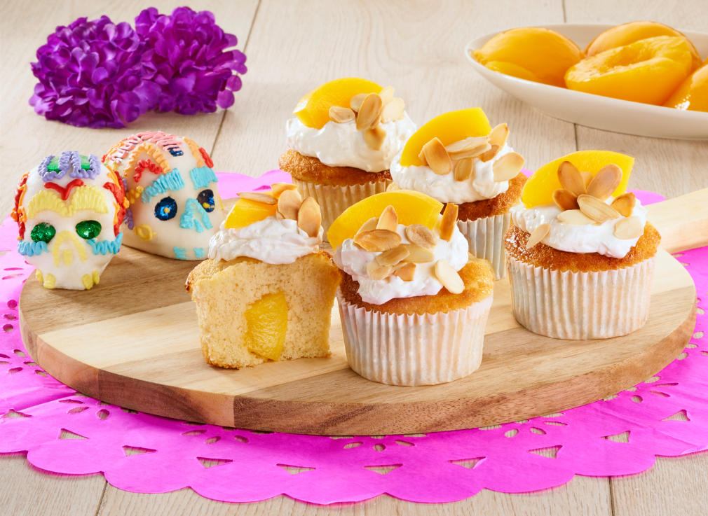 4. Vaciar la mezcla de cupcakes sobre un molde para cupcakes con capacillos, colocar al centro un cuadrito de durazno.