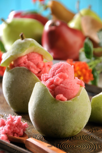 - Para hacer las peras congeladas, corta la punta con un cuchillo como si fuera una tapa; con una cuchara y con cuidado retira toda la pulpa dejando la piel intacta, rocía con jugo de limón, guárdalas en un molde de plástico con tapa y congela por una noche al igual que el helado.