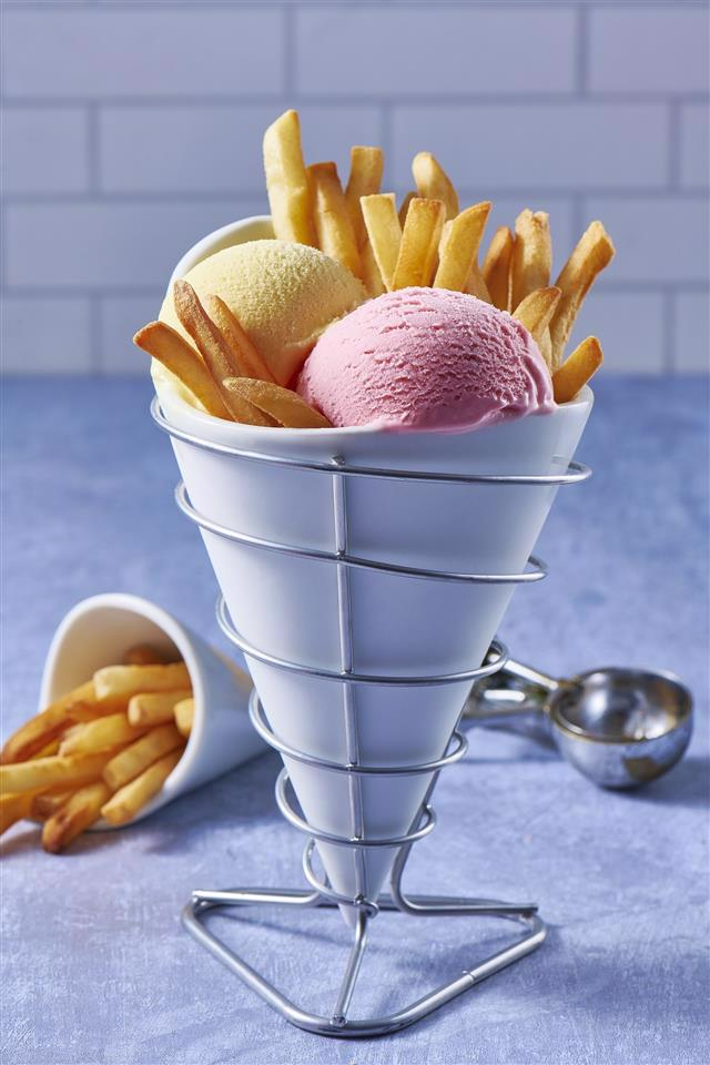 - En un tazón, o sobre un cono sirve las papas, helado de fresa y helado de vainilla.