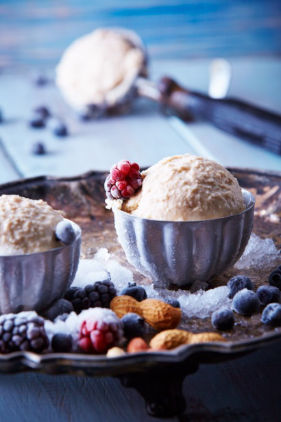 - Licúe el extracto de vainilla, crema de cacahuate, azúcar y crema; agregue los cacahuates troceados. Envuelva los frutos rojos en la mezcla.