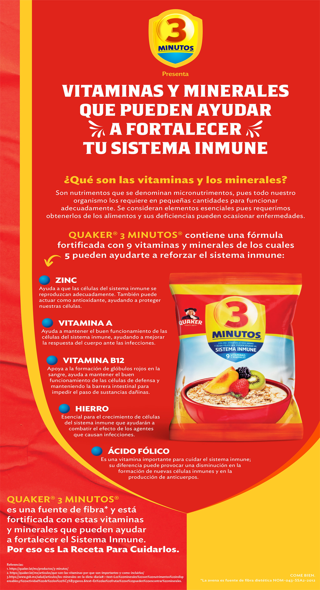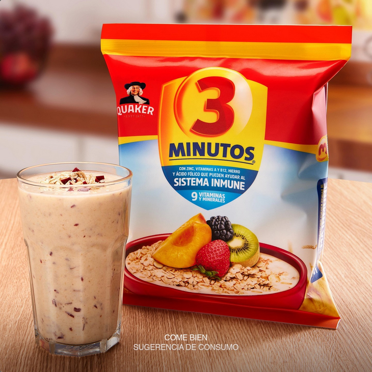 En este sentido, invertir solo tres minutos en una elección nutricional puede marcar una  diferencia para ti y tus seres queridos. Productos como la avena Quaker® 3 MINUTOS® con su fórmula fortificada, proporcionan una combinación de vitaminas, minerales esenciales que pueden ayudar a reforzar nuestras defensas.
