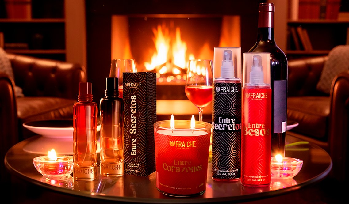 La colección incluye dos perfumes Fraiche personalizables de 60 mL, Entre Besos y Entre Secretos, un dúo que representa dos historias distintas unidas por un mismo sentimiento. Sus aromas se complementan y dialogan entre sí, creando una propuesta pensada para compartir, conectar y celebrar la autenticidad de cada relación.