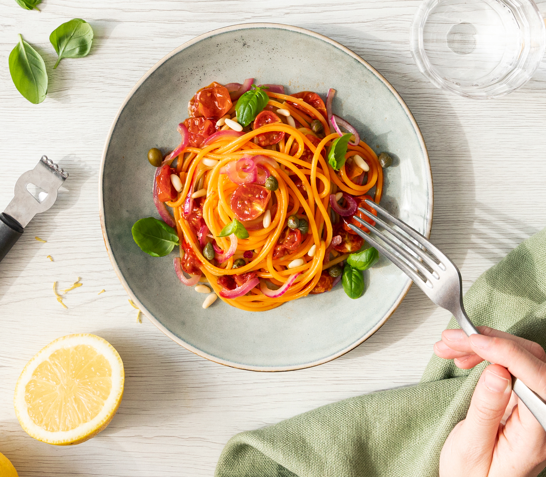 Spaghetti con tomates deshidratados y alcaparras