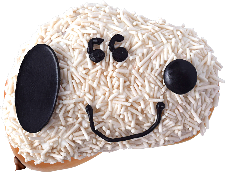 SNOOPY. Innovador shell con la tradicional forma de Snoopy, relleno de chocolate, cubierto con granillo blanco, una nariz y oreja de chocolate, una combinación de lo más tierna y deliciosa.