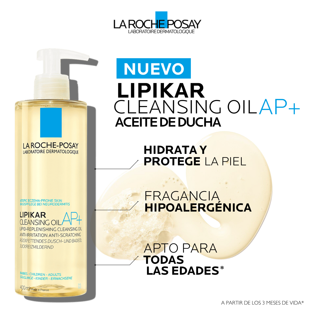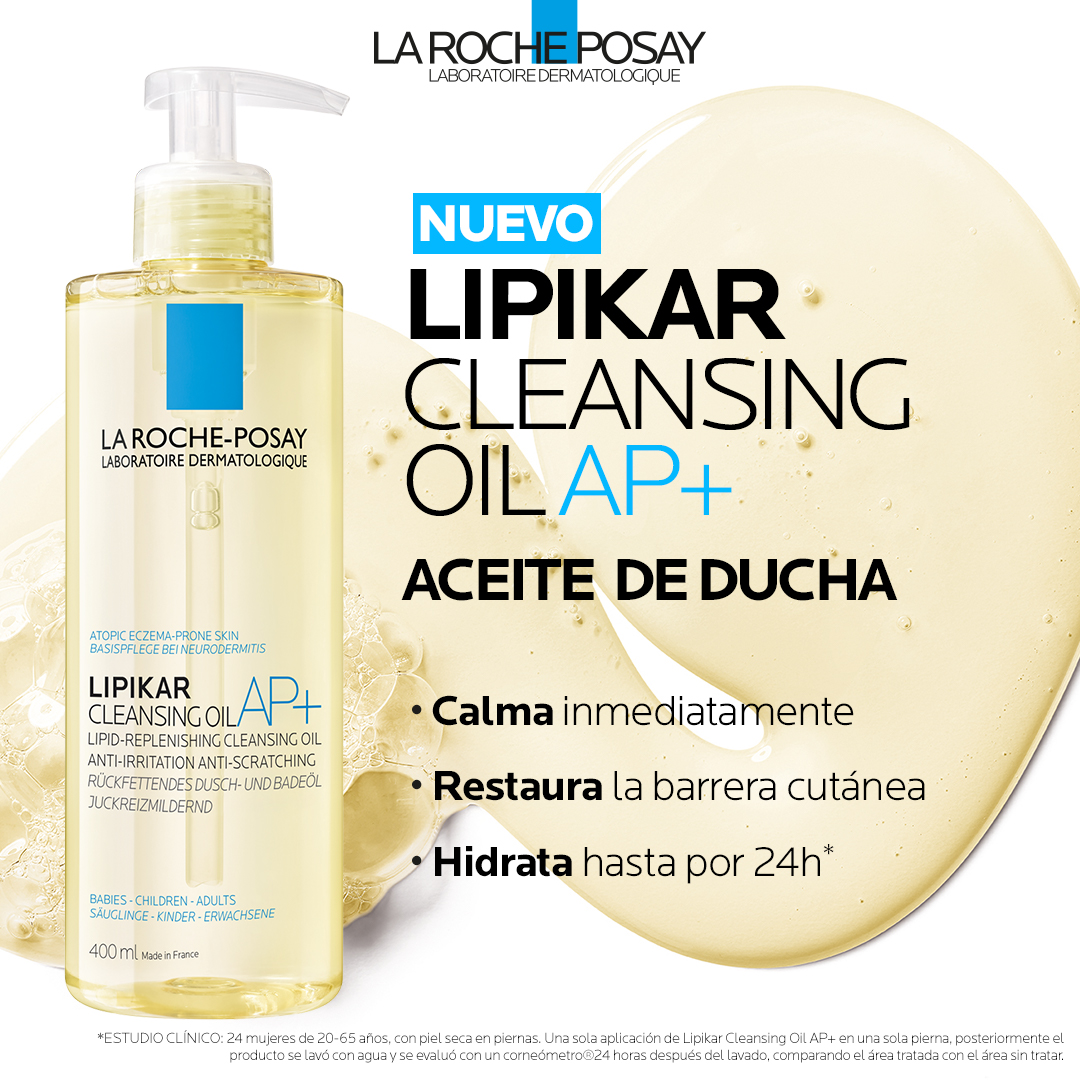 • Lipikar Cleansing Oil AP + es el aceite de ducha que hidrata y protege la piel durante el baño, ya que cuenta con activos clave que ayudan a restaurar la barrera cutánea e hidrata hasta por 24h y hace espuma.