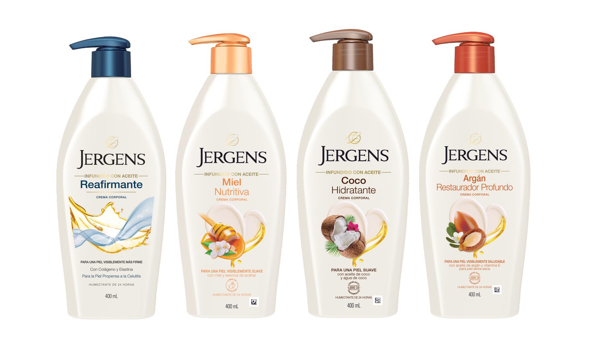 - Humectante Jergens® Reafirmante: Ideal para pieles resecas y propensas a la celulitis, esta loción ayuda a reafirmar y mejorar la elasticidad de la piel para entregar un aspecto visiblemente más firme y radiante. Su fórmula, con una mezcla de Hydralucence®, colágeno y elastina, mejora la resiliencia, elasticidad y firmeza de la piel, además alivia la resequedad y repone la humedad para mejorar el tono, la textura y la luminosidad.