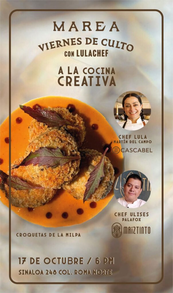 Para esta edición especial, Marea presentará un menú a la carta con seis platillos exclusivos, tres diseñados por la chef Lula Martín del Campo y tres por el chef Ulises Palafox, inspirados en las croquetas de la milpa, que invitan a redescubrir los sabores de México con un toque lúdico y contemporáneo.