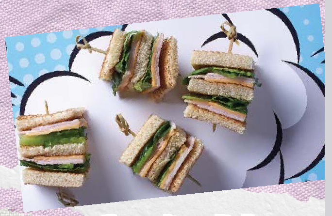 Incluye cereal (pan integral), fruta (sandía, zanahoria, pepino) y alimentos de origen animal (pechuga de pavo y queso panela):