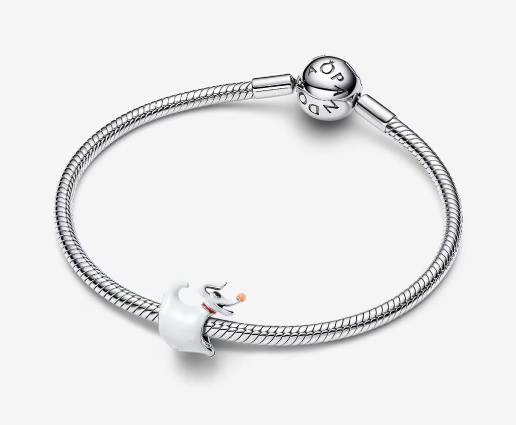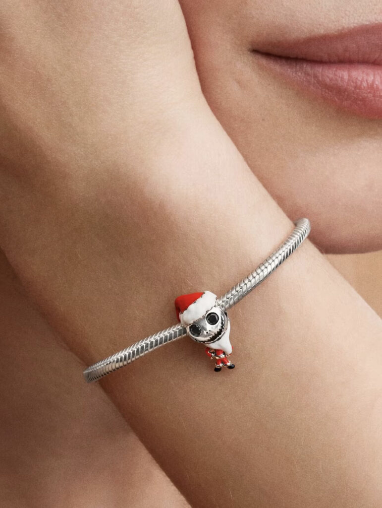 El charm principal presenta a Jack Skellington en su versión navideña, vestido de Santa Claus, diseñado en plata esterlina con esmalte rojo y blanco, mientras que Zero, su fiel compañero, flota en un diseño etéreo que aporta un toque de luz y fantasía.