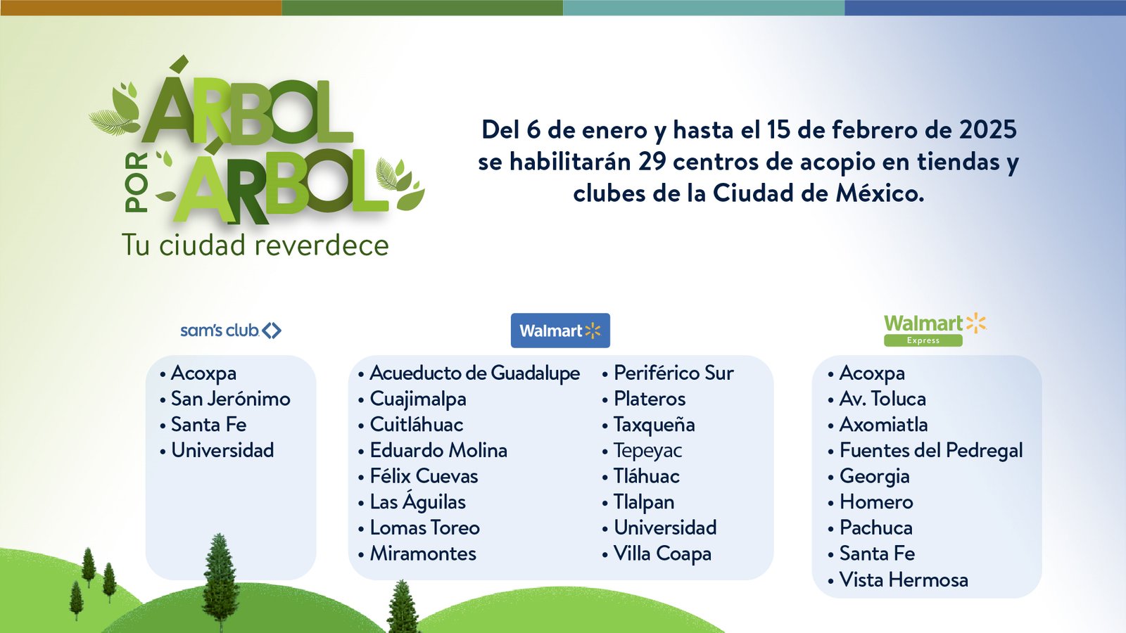 Como parte de su compromiso con el manejo responsable de recursos naturales, Walmart de México y Centroamérica, en alianza con el Gobierno de la Ciudad de México, impulsa desde hace 25 años la iniciativa “Árbol por Árbol”, que promueve el reciclaje de pinos navideños naturales para reincorporarlos a nuevos ciclos de valor.
