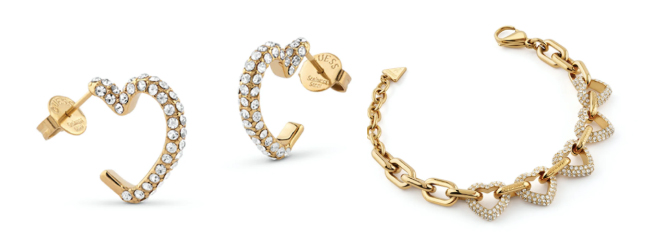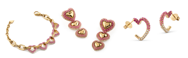 - Anillos y aretes con motivos de corazón, que combinan simplicidad y glamour con acabados deslumbrantes.