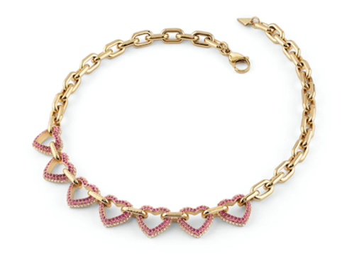 - Collares y colgantes con corazones bañados en cristales, ideales para un look romántico y moderno.