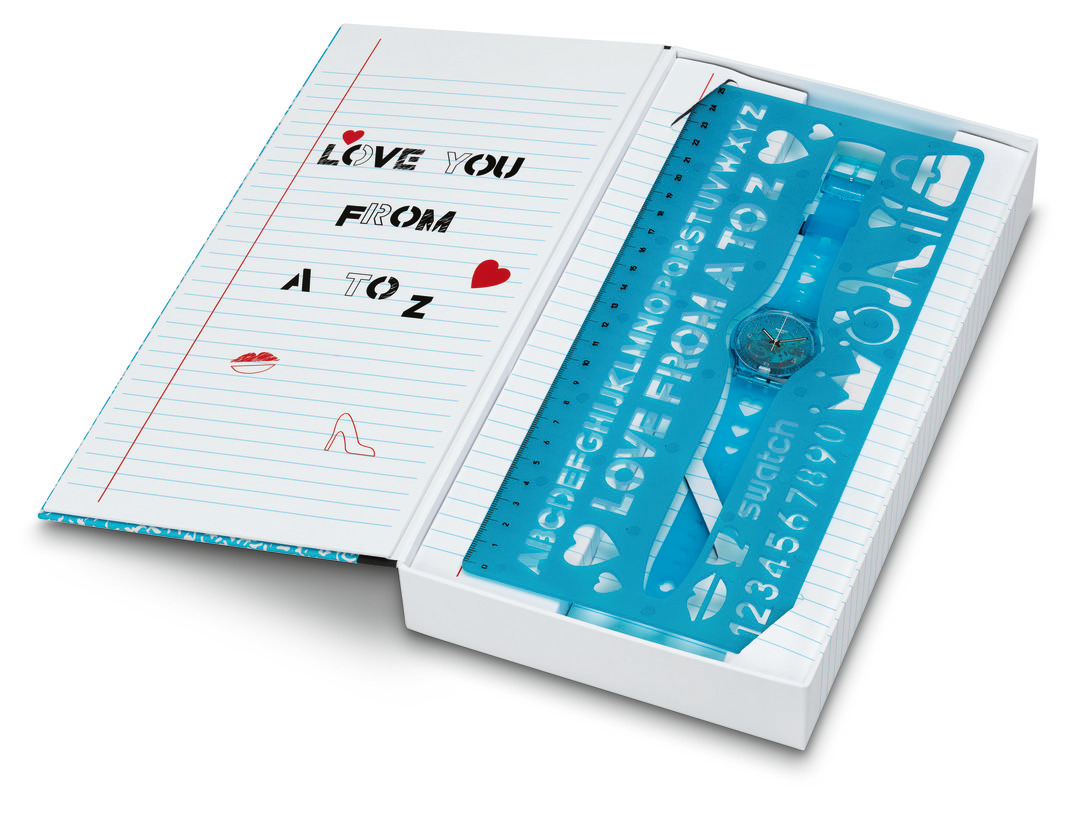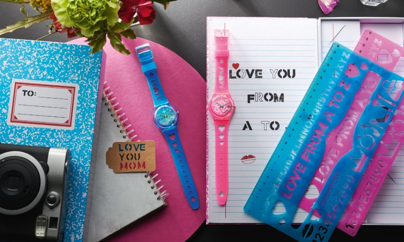 Disponibles en rosa (LOVE WITH ALL THE ALPHABET) y azul (LOVE FROM A TO Z), los dos modelos tienen una esfera, transparente, agujas Swatch Glow y una caja brillante y transparente que permite ver el mecanismo que hay debajo. En la correa se han recortado un corazón y la palabra «mom», que significa «mamá» en inglés, ambos detalles inspirados en el diseño de una regla antigua.