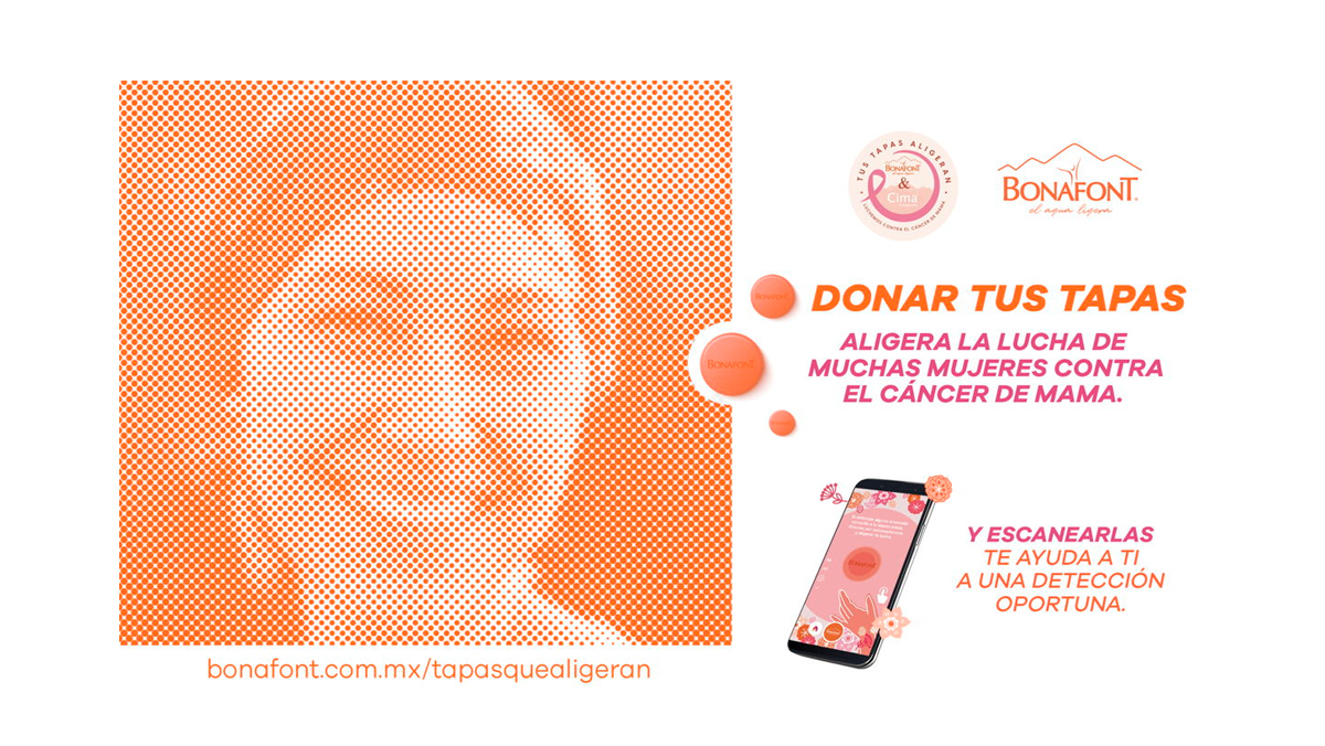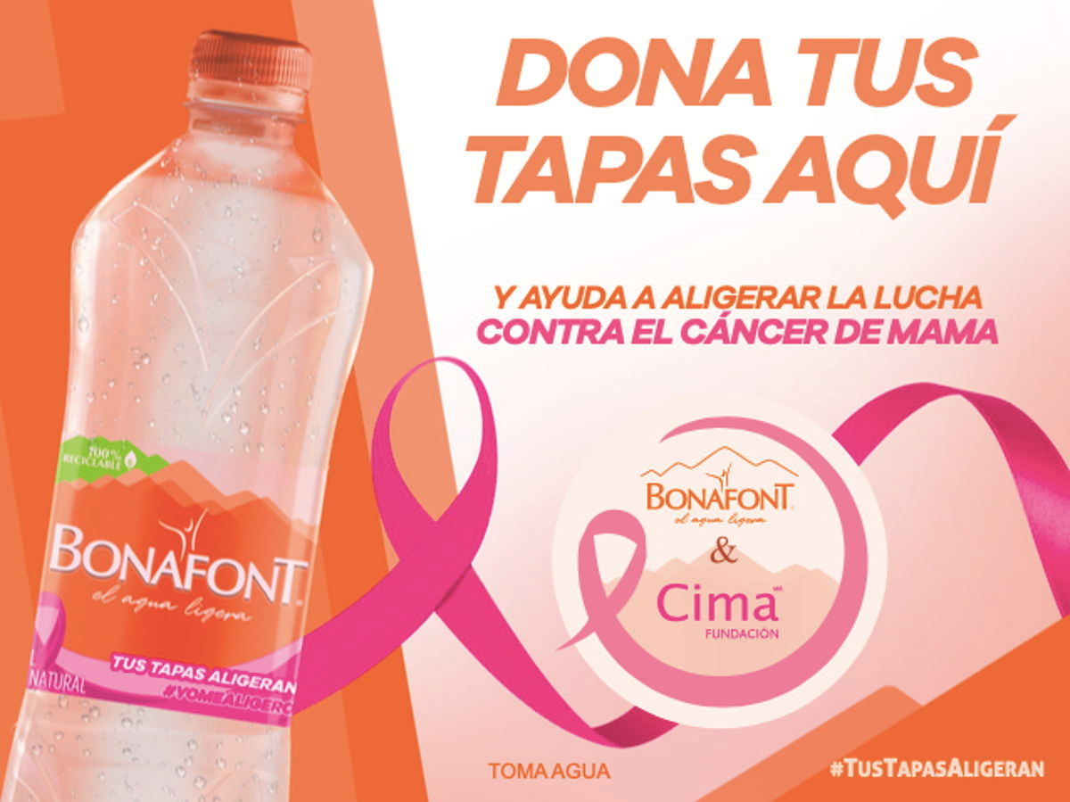 Bonafont en apoyo a las mujeres que luchan contra esta enfermedad todos los días, por segundo año consecutivo lanzan la campaña “Tapas Que Aligeran” con la finalidad de aligerar este camino poniendo a su alcance herramientas que las ayuden a cuidarse y crear conciencia sobre el padecimiento. La campaña tiene como objetivo invitar a todos sus consumidores a apoyar con la recolección y donación de tapas que se transformarán en ayuda activa en la entrega de prótesis de mamas externas, mangas para prevenir y controlar el linfedema, pelucas oncológicas y turbantes, sesiones de apoyo emocional e insumos postoperatorios.