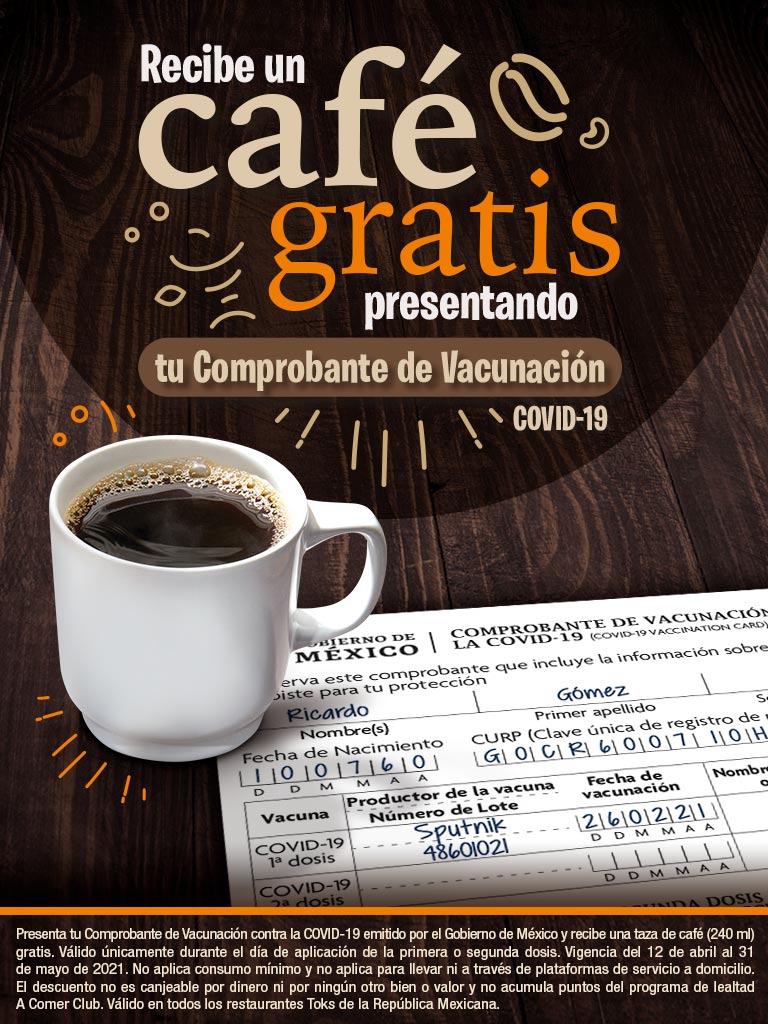 Toks, la cadena de restaurantes con casi 50 años de sabor y tradición en México, invita a todos los comensales a visitar sus restaurantes para disfrutar gratis de una taza de café americano 100% mexicano, el día que se apliquen la primera y/o segunda dosis de la vacuna contra Covid-19.