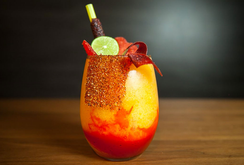 - Sirve en un vaso hondo previamente escarchado con chile en polvo y ahora decora con el chamoy líquido y las banderillas de tamarindo.