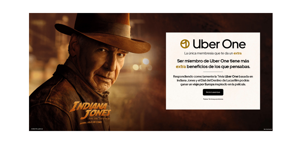 • Quienes participen tendrán que responder una trivia sobre la nueva película de Lucasfilm, INDIANA JONES Y EL DIAL DEL DESTINO, ya disponible en cines, y sobre la membresía Uber One