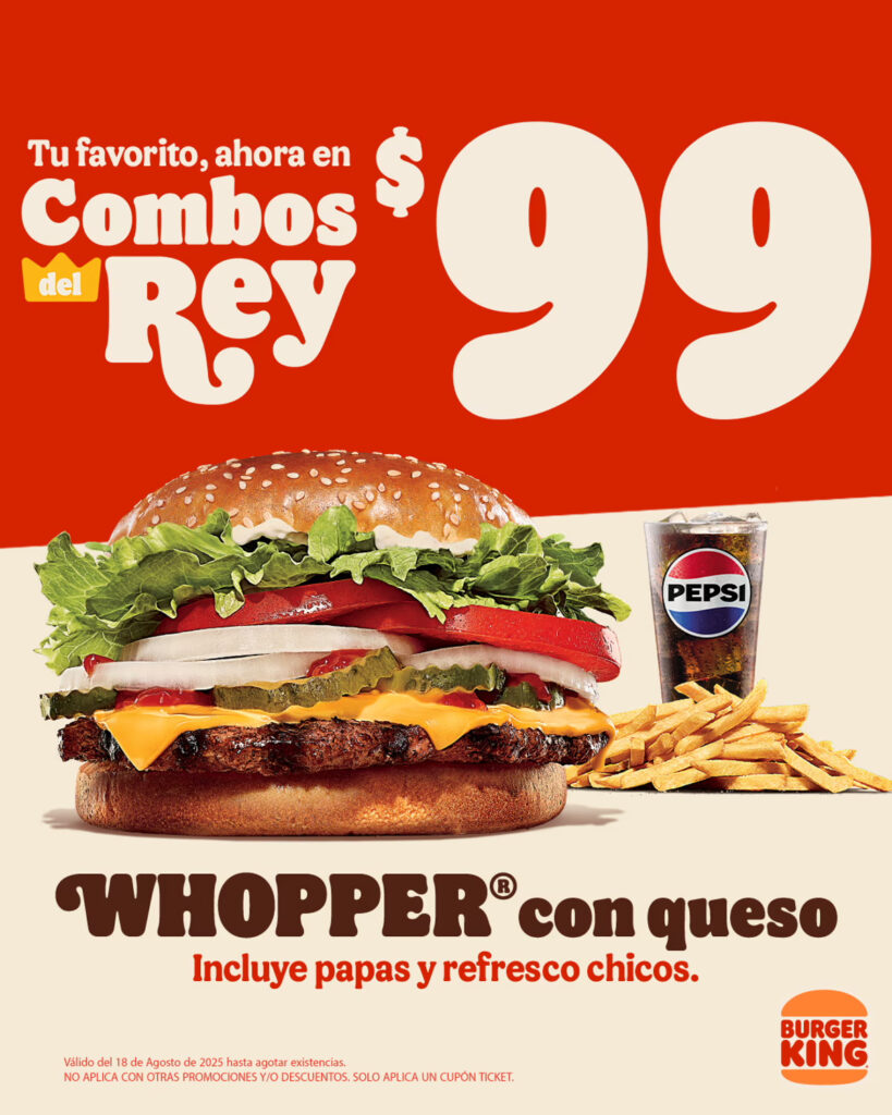Burger King, la casa del icónico WHOPPER®, celebra en grande al sumar a su producto insignia a la plataforma Combos del Rey, con una opción completa y accesible por sólo $99 pesos. Ahora, los amantes del sabor a la parrilla podrán disfrutar del WHOPPER® con queso en un combo especial (papas y refresco chicos), disponible por tiempo limitado en todos los restaurantes Burger King. ​